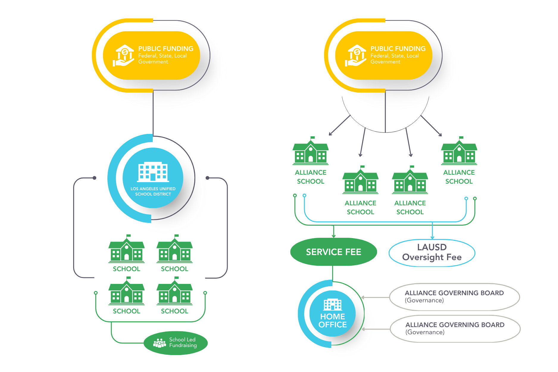 Direct Government Funding to Districts: Traditional public schools receive their primary funding from federal, state, and local governments. However, these funds are not sent directly to individual schools. Instead, they go to the central school district (e.g. LAUSD).
